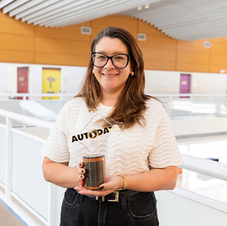 Legenda da imagem: Sabrina Leme, especialista em Comunicação e Marketing da Marcopolo, recebeu a premiação do diretor da AutoData, Leandro Alves